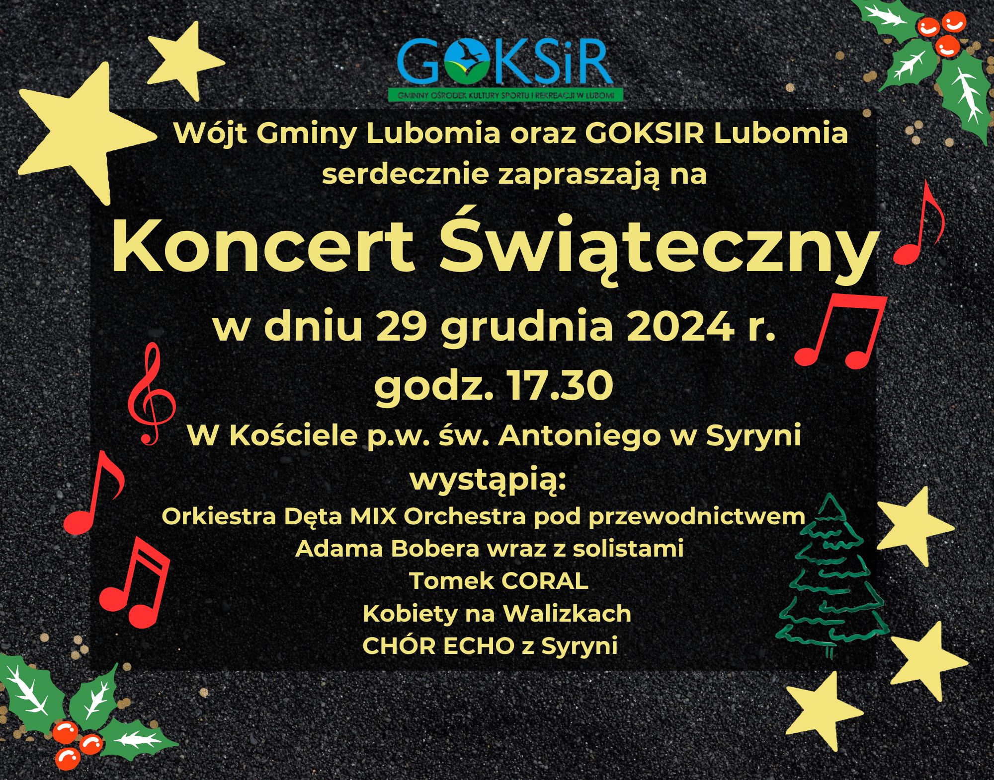 Z radością zapraszamy wszystkich mieszkańców Gminy Lubomia na wyjątkowy Koncert Świąteczny, który odbędzie się 29 grudnia 2024 roku o godzinie 17:30 w Kościele w Syryni.