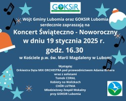 Wójt Gminy Lubomia oraz Gminny OÅ›rodek Kultury, Sportu i Rekreacji w Lubomi zapraszajÄ… na Koncert ÅšwiÄ…teczno-Noworoczny, który odbÄ™dzie siÄ™ 19 stycznia 2025 roku w KoÅ›ciele w Lubomi. To wyjÄ…tkowe wydarzenie bÄ™dzie doskonałą okazjÄ… do wspólnego Å›wiÄ™towania okresu Å›wiÄ…tecznego i noworocznego w artystycznej atmosferze. Serdecznie zapraszamy wszystkich mieszkaÅ„ców i goÅ›ci do uczestnictwa w tym muzycznym spotkaniu.