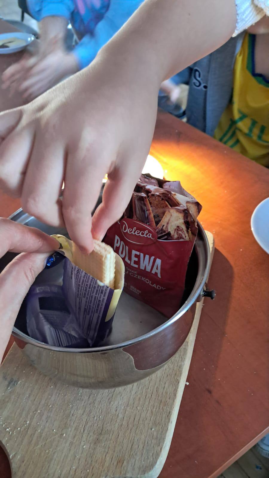 Po dokładnym umyciu rączek mali artyści zabrali się do pracy — z wafelków i słodkich dodatków powstały przepiękne (i pyszne!) kredki.
