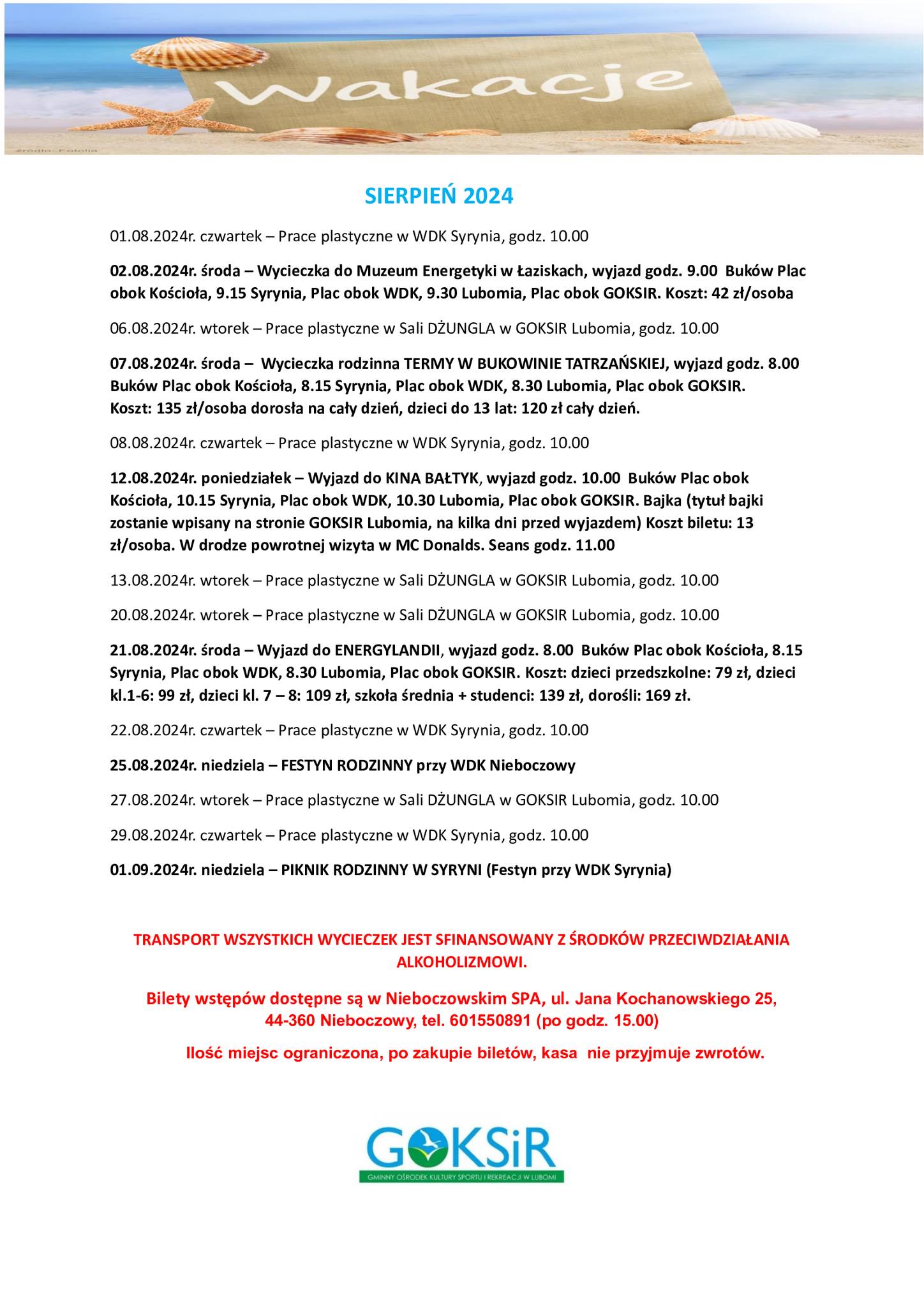 TRANSPORT WSZYSTKICH WYCIECZEK JEST SFINANSOWANY Z ŚRODKÓW PRZECIWDZIAŁANIA ALKOHOLIZMOWI.