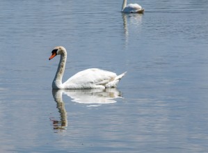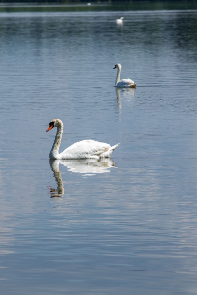 Zdjęcie przedstawia łabędzie w wodzie