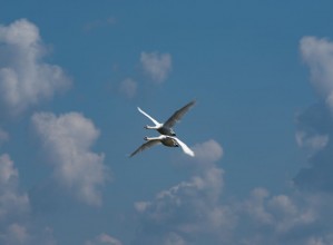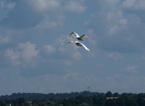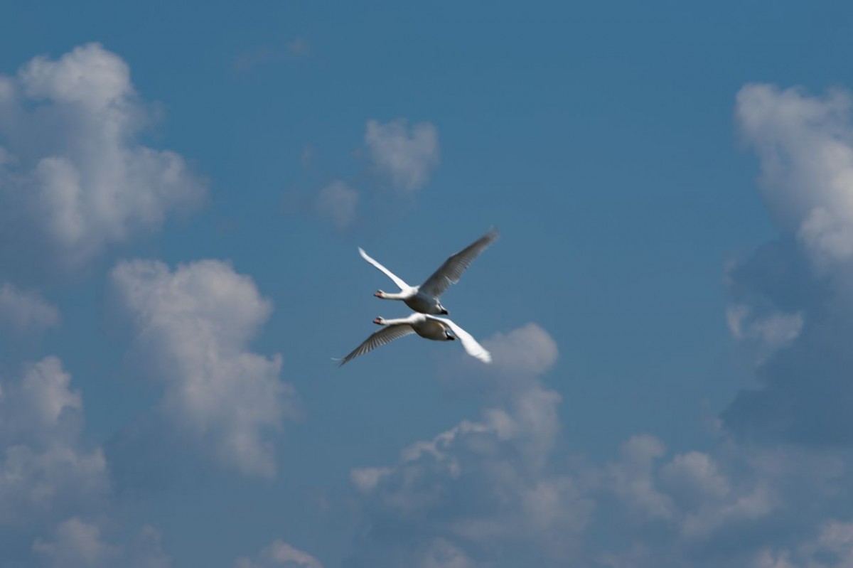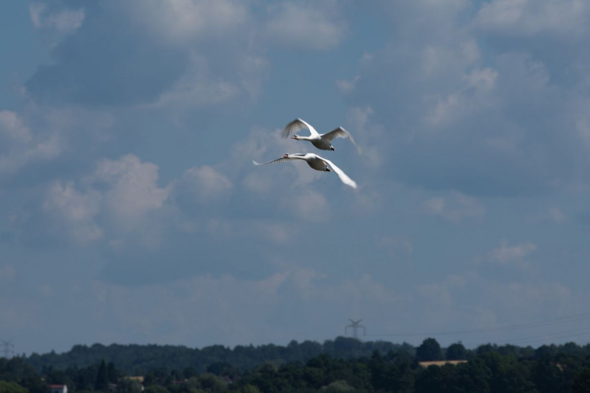 Zdjęcie przedstawia lecące łabędzie