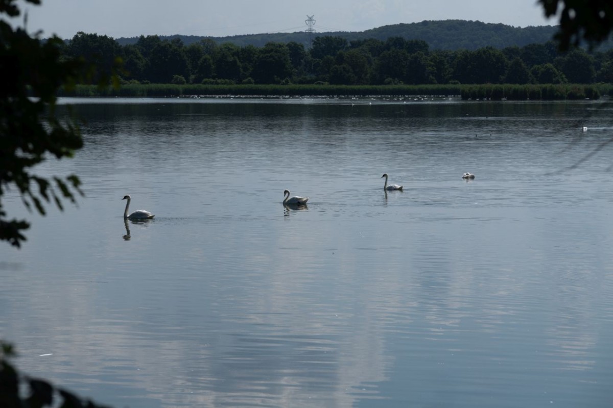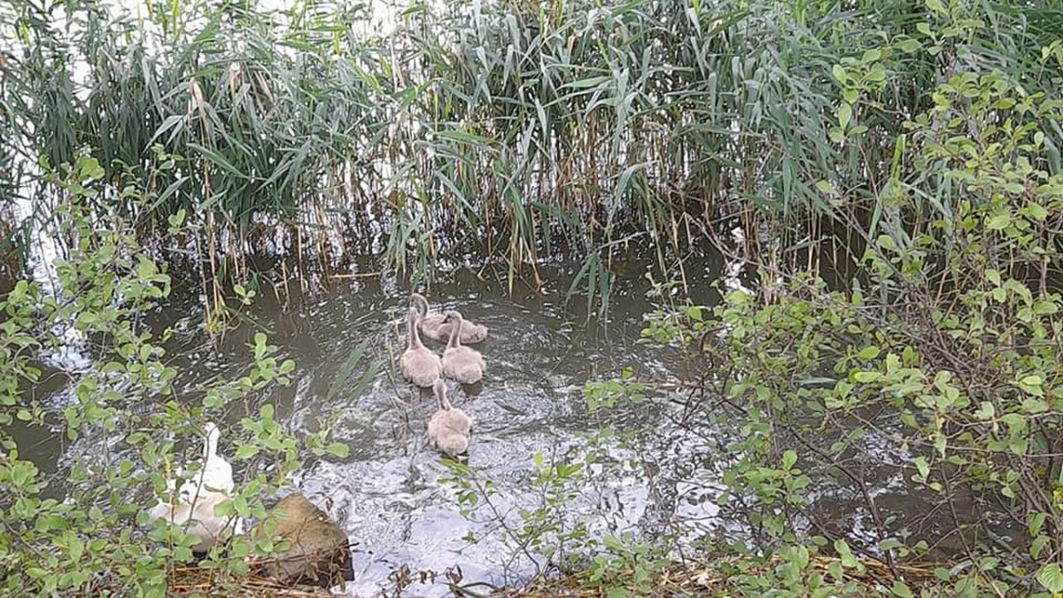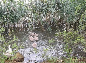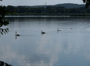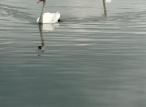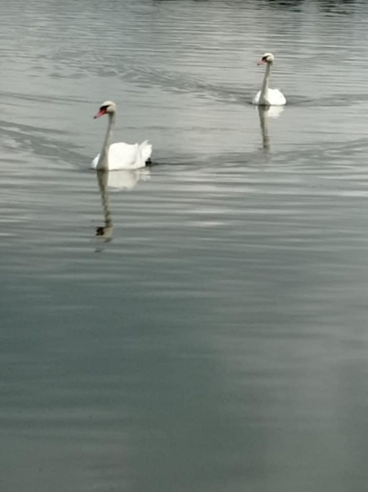 Zdjęcie przedstawia łabędzie w wodzie